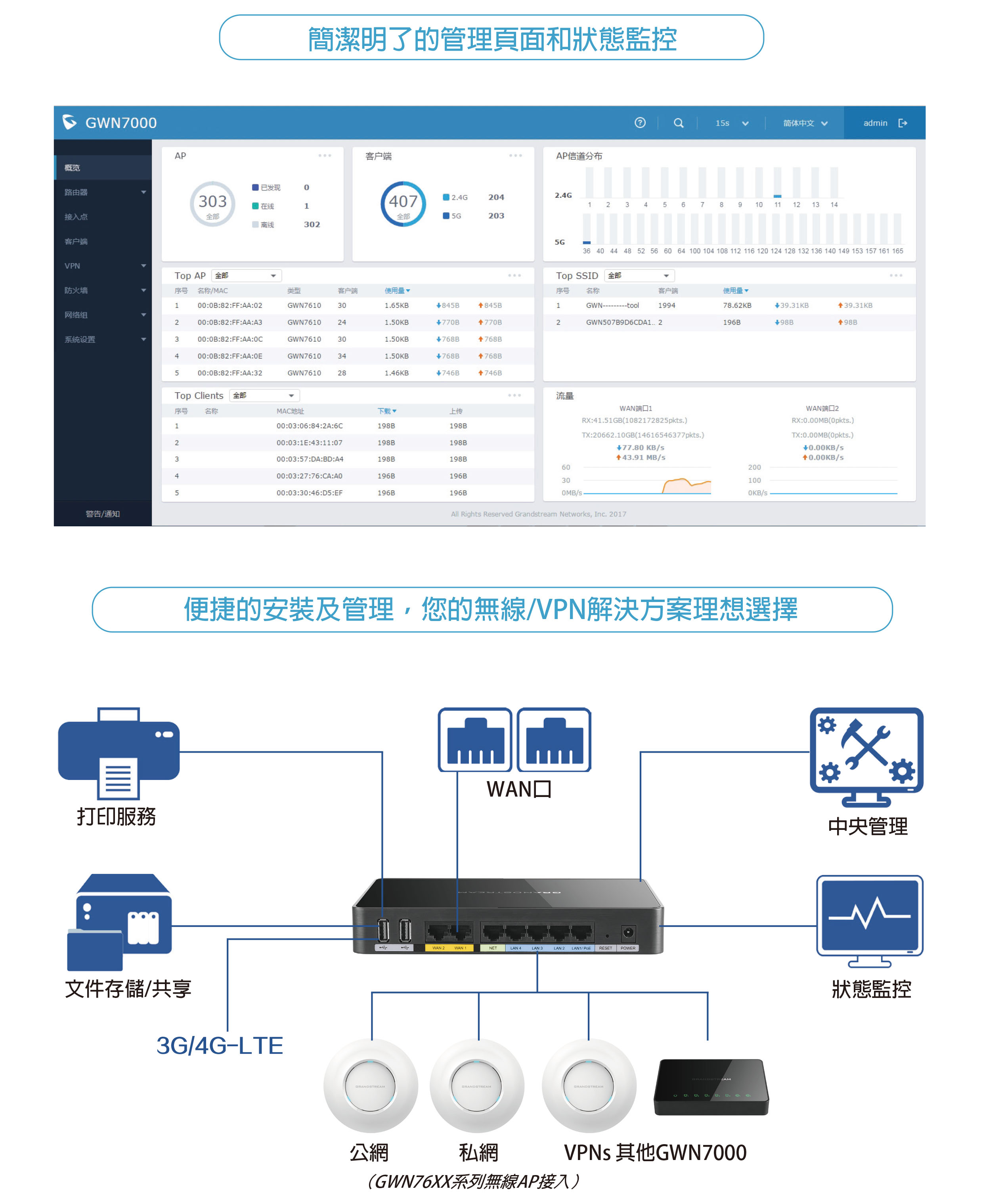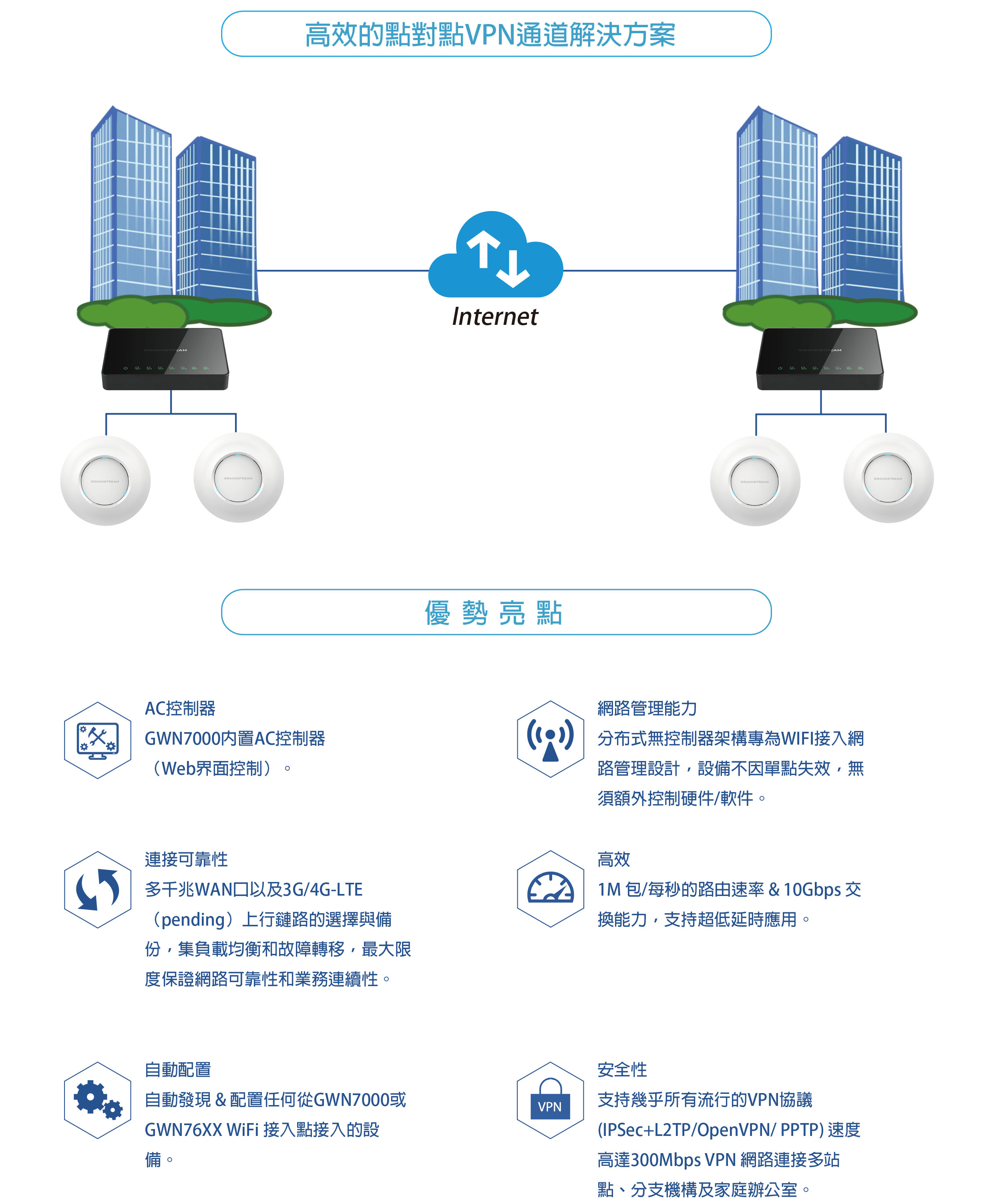 GWN7000是企業,中小型企業,零售,教育,酒店和醫療市場的理想選擇,支持可在一個或多個不同物理位置共享的全面WiFi和VPN解決方案。
