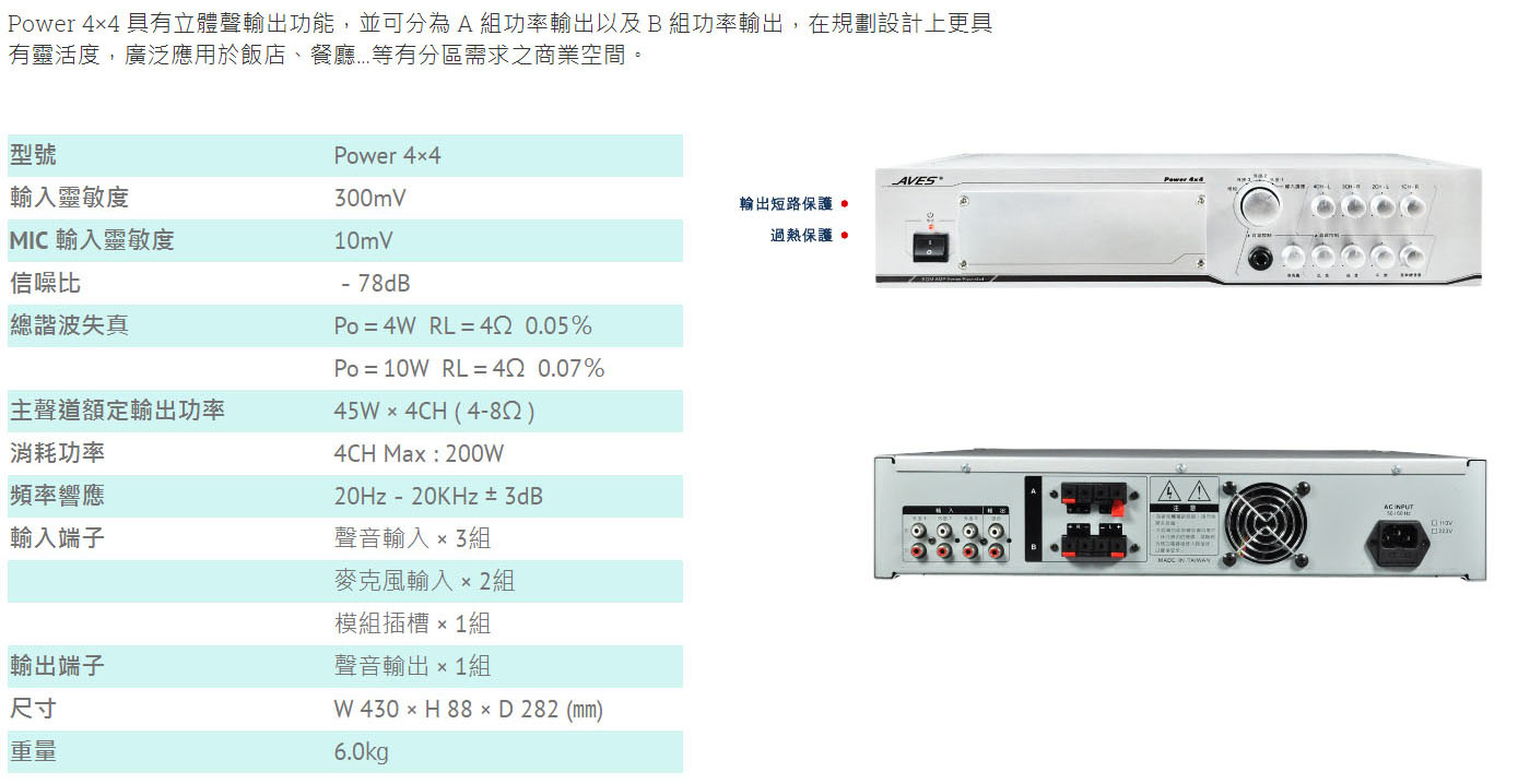 AVES 商用立體多聲道模組擴大機 Power 4X4