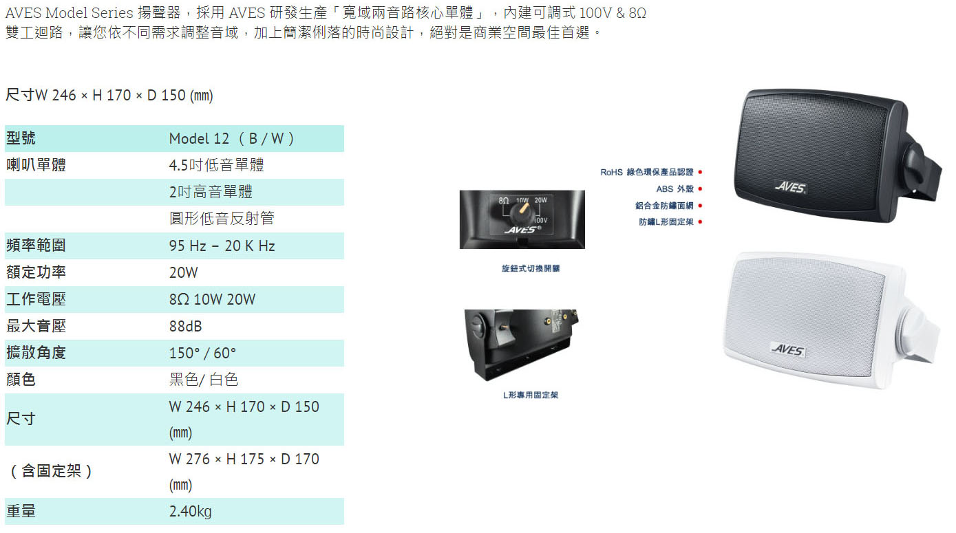 AVES 壁掛揚聲器 Model 12 ( B & W )