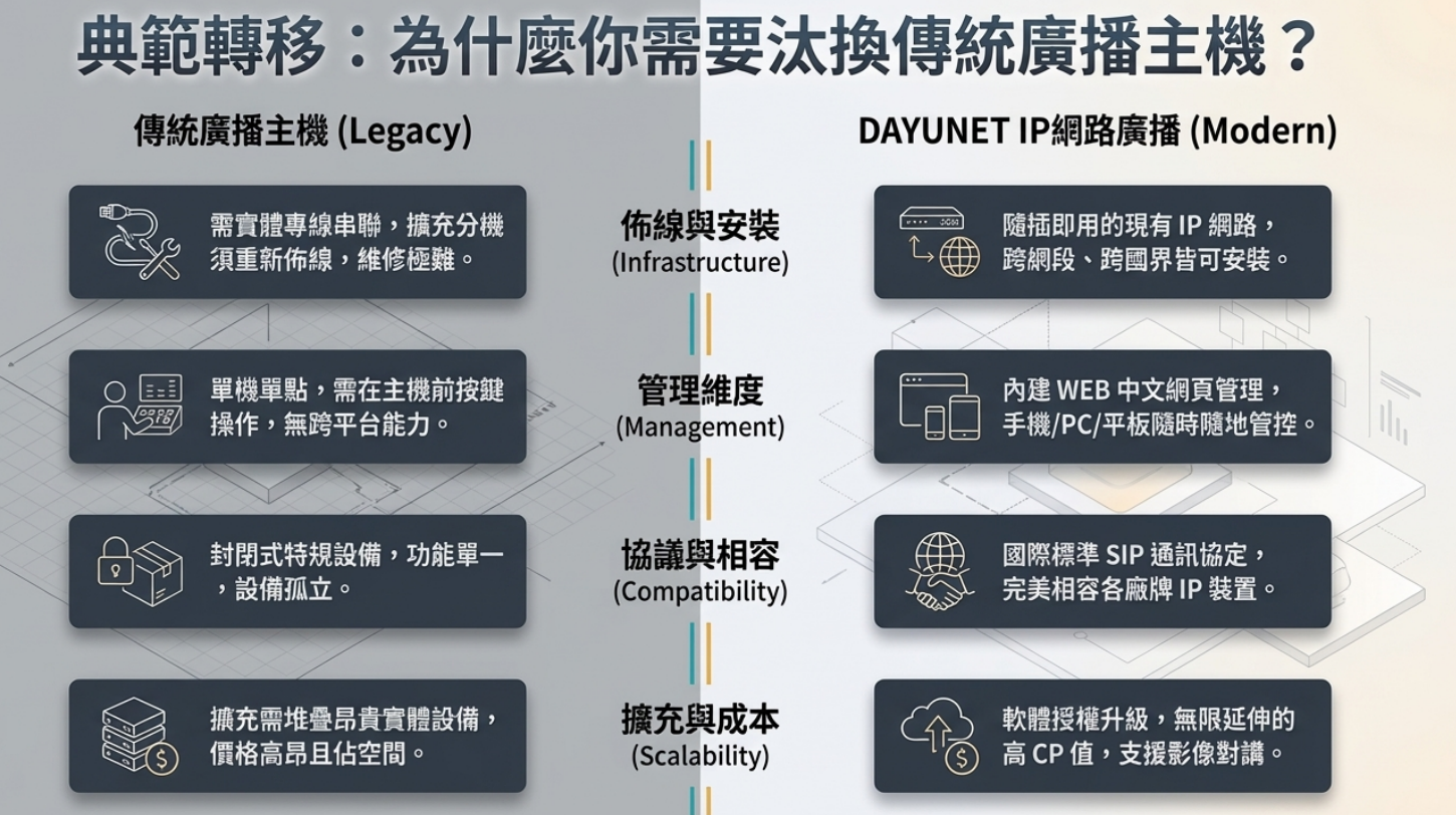 將傳統廣播系統升級為SIP廣播,可有效提高通信效率,提供多場景IP化改造,並獲得更多擴展功能。
