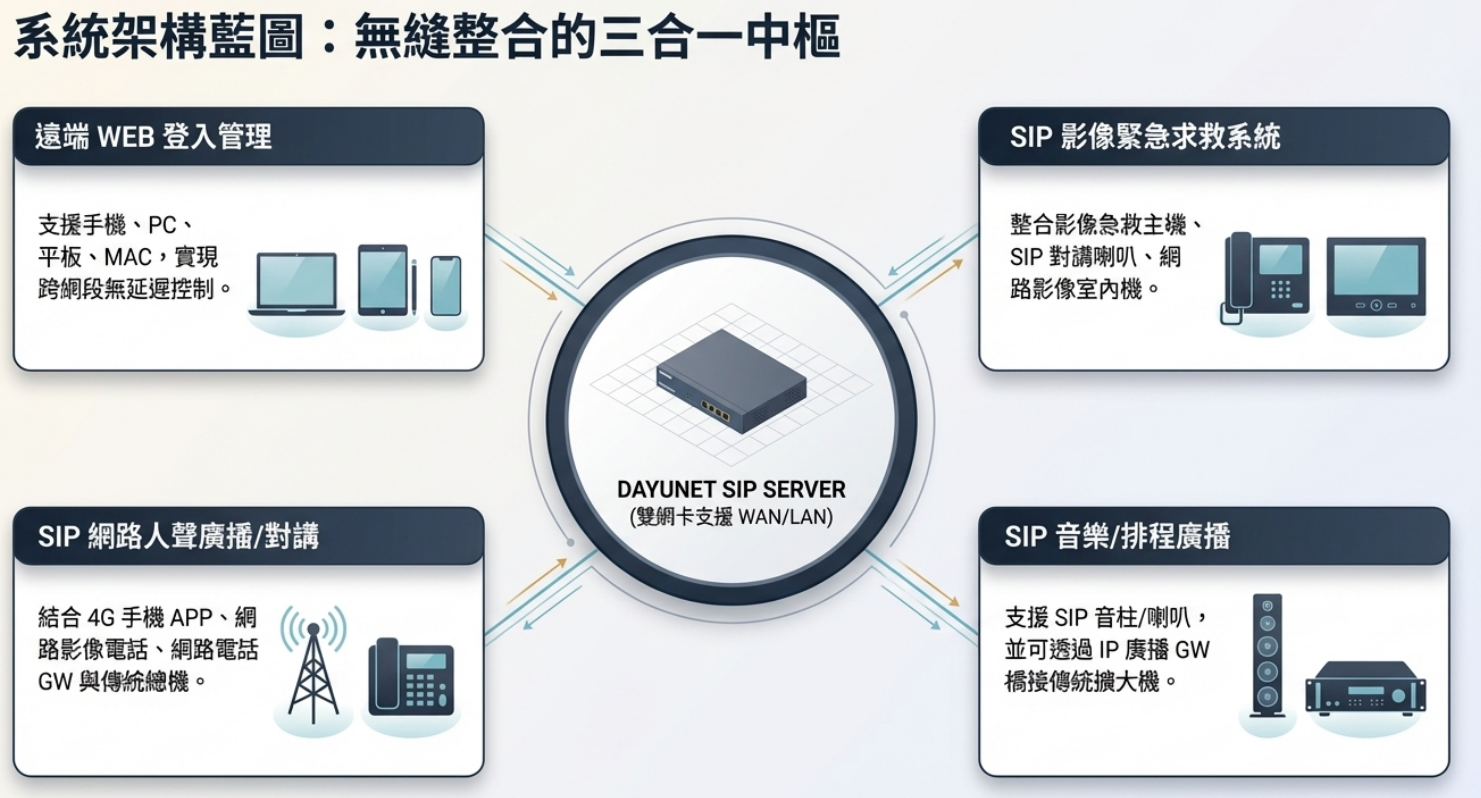1.應答觸發:搭配 SIP 轉換器:支援 RELAY 功能可同步應答擴大機進行廣播