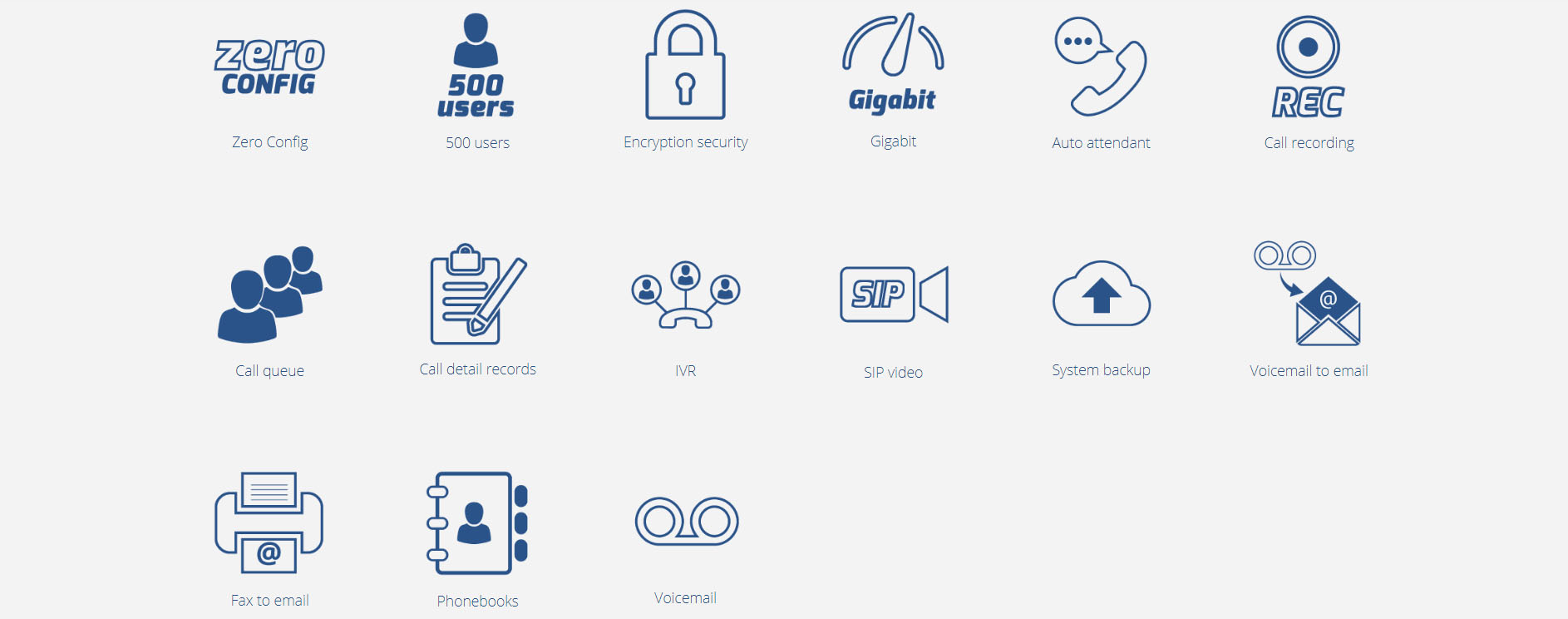 該IP PBX系列允許企業將多種通信技術(如語音,視頻通話,視頻會議,視頻監控,數據工具,移動選項和設施訪問管理)統一到一個可以遠程管理和/或訪問的公共網絡上。
