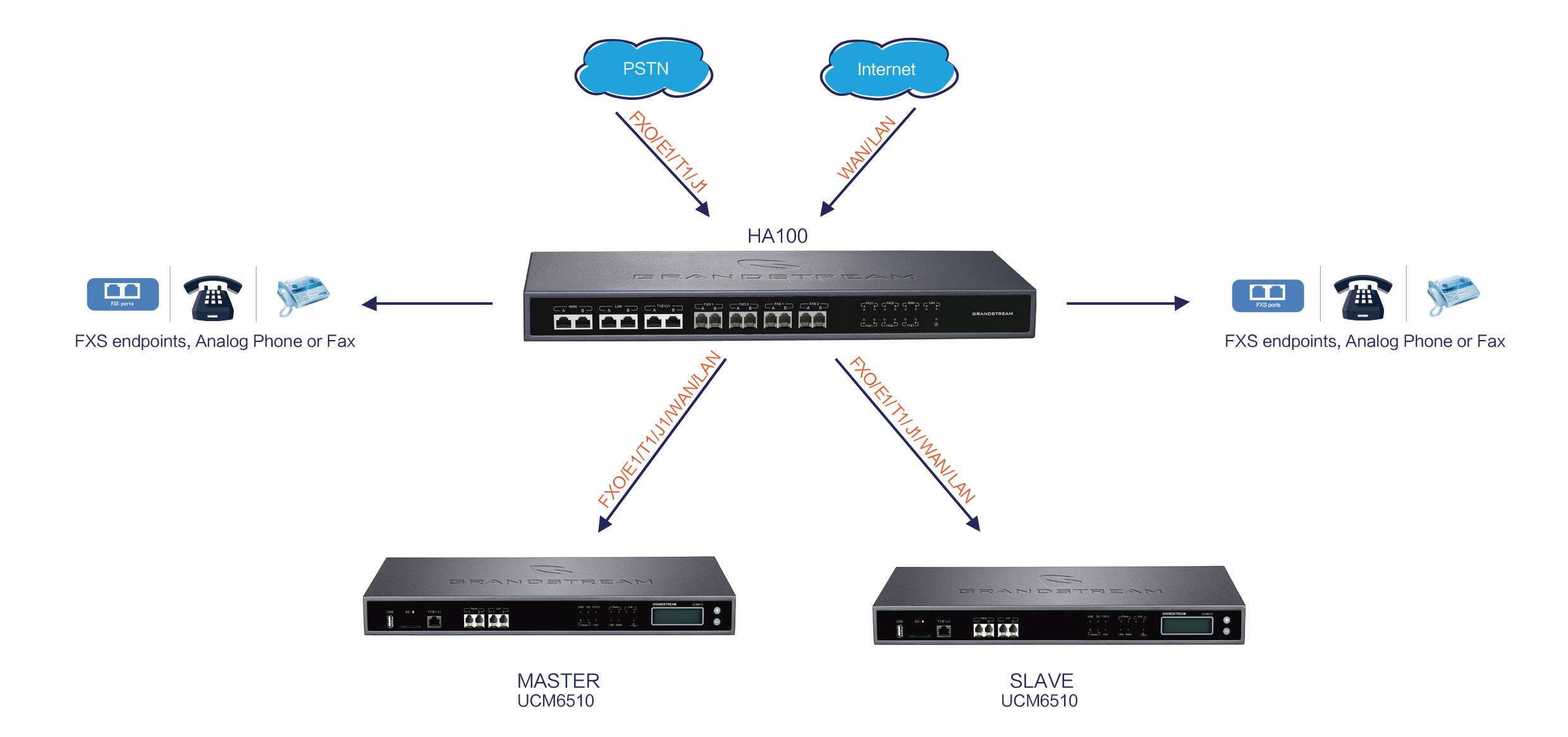 ●將兩個UCM6510連接到HA100以創建備份解決方案,適用於需要高可靠性的UC系統的企業,無懼任何中斷或故障