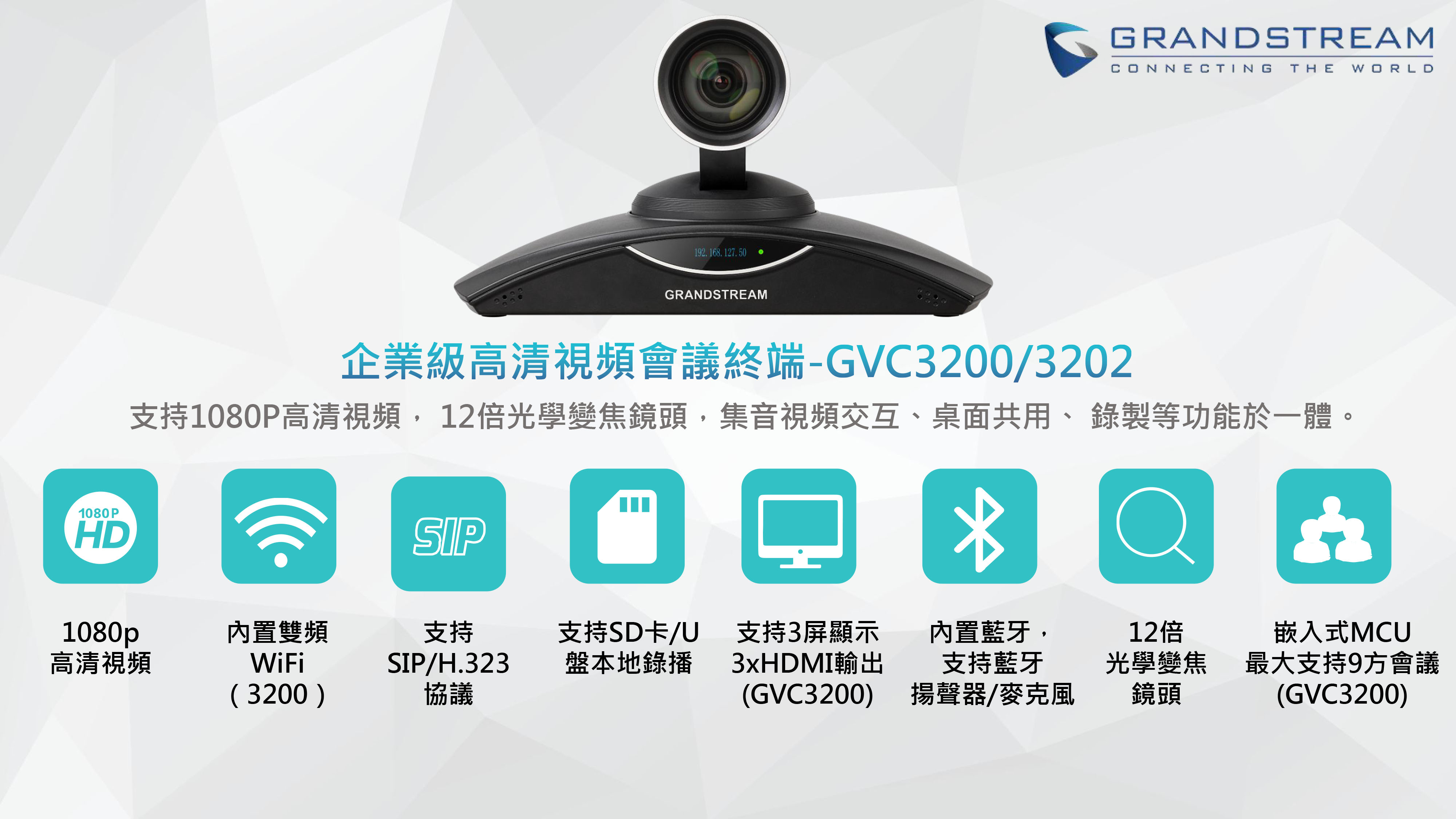 針對希望通過多功能靈活系統使用強大的會議和協作功能的組織的視頻會議解決方案。 GVC3200是任何通信網絡的強大補充。通過面對面,不分地點增加會議協作。