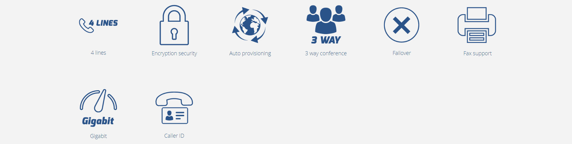 TCP/IP/UDP, RTP/RTCP, HTTP/HTTPS, ARP/RARP, ICMP, DNS, DHCP, NTP,TFTP,TELNET, STUN, SIP (RFC3261), SIP over TCP/TLS, SRTP, TR-069 |