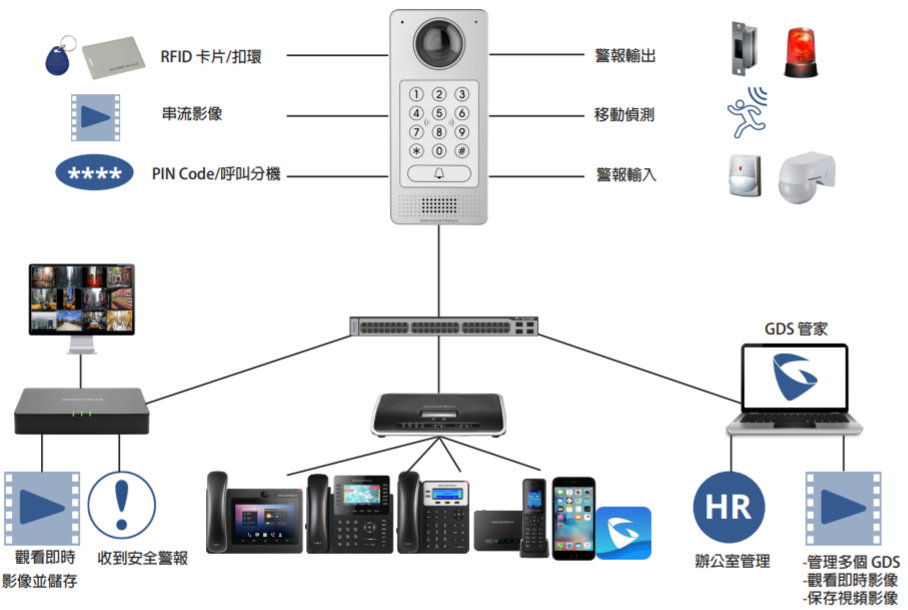 GDS3710 是一款 IP 視頻門禁系統,還可用作高清 IP 監控攝像頭和 IP 對講機,為各種規模的建築物提供設施訪問控制和安全監控。這款功能強大的 IP 視頻門禁系統提供 180 度視頻視角以實現牆到牆覆蓋,具有用於安全無鑰匙進入的內置 RFID 芯片閱讀器,包括內置麥克風和揚聲器以支持對講功能並提供警報與現有安全設備集成的輸入和警報輸出支持。GDS3710 與潮流的免費管理實用程序軟件 GDS Manager 集成,允許通過該軟件完全管理 RFID 卡信息、視頻饋送以及設備本身。通過符合 ONVIF Profile S ,GDS3710 可以與任何第三方 ONVIF 兼容的監視或記錄解決方案集成。GDS3710 由先進的圖像傳感器處理器 (ISP) 和最先進的圖像算法提供支持,可提供 1080p FHD 視頻分辨率,並在所有光照條件下提供卓越的性能。它採用 SIP/VoIP 技術,將 2 路音頻和視頻流饋送直接加載到智能手機、SIP 端點和 GDS 管理軟件。GDS3710 配備了用於無縫安裝的集成 PoE、用於照明的明亮 LED、用於安全保護的運動探測器、照明控制開關等。GDS3710、潮流的 GXP21xx IP 電話、GXV 視頻電話和潮流波移動應用程序的組合為門禁、視頻對講和安全需求提供了完整的解決方案。